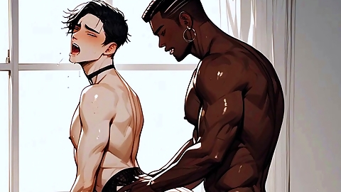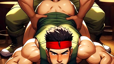 Hot yaoi threesome with dominant vibes in manga style