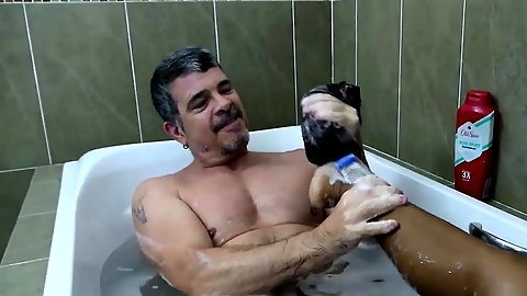 Mature perv Daddy enjoys taking bath with young stud Russel