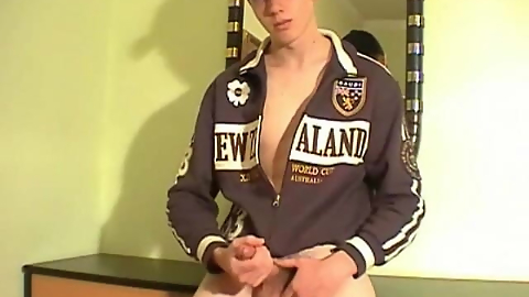 Blonde cutie Angel R gets busy stroking his morning wood with solo pleasure