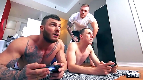 Jocks Nick Fox, Daniel Karrington, and Danny Jones get down in a wild three-way featuring assplay and blowjobs